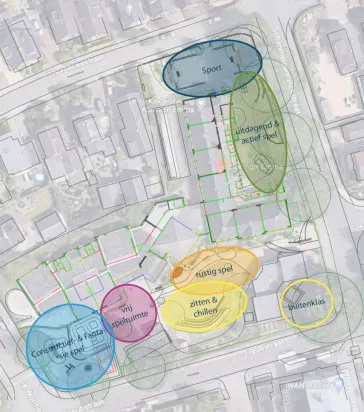 Er is gekozen om het schoolplein op te delen in verschillende zones. In elke zone kunnen kinderen iets anders doen.